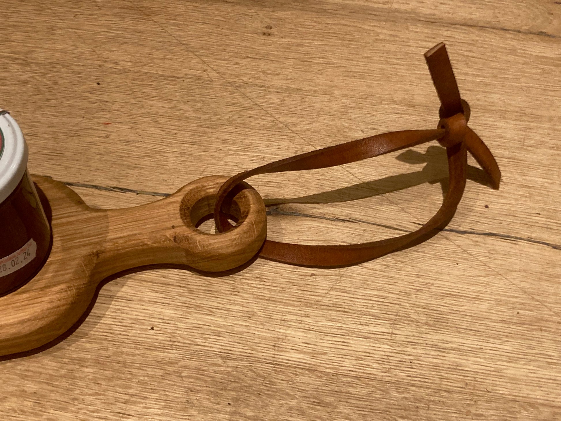 Das Brettchen ist 35 cm lang, 10 cm breit und 2,5 cm stark. Es sind zwei Vertiefungen in das Brett gefräst für die beiden Fruchaufstriche! Am Griff ist ein schönes Lederband für die Aufhängung gebunden.