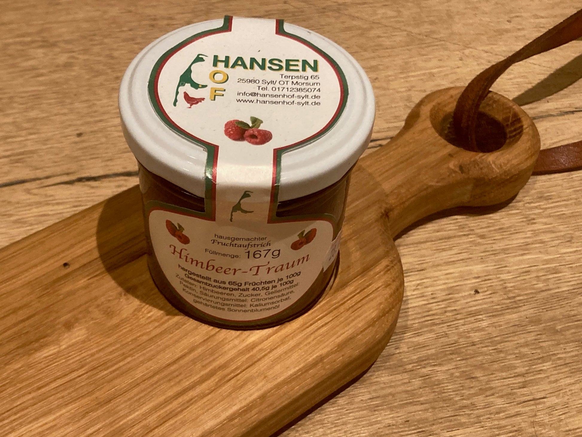 Servierbrett aus Eiche mit Fruchtaufstrich "Erdbeer" und "Himbeer" vom Hansenhof Sylt!