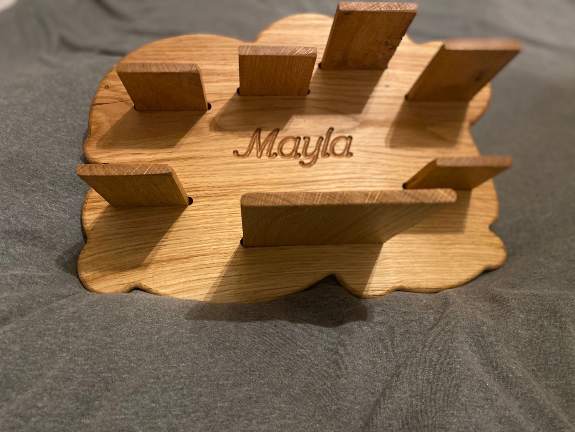 Auf Wunsch erhält das Regal eine personalisierte Fräsung – z.B. den Namen Ihres Kindes, ein Datum oder ein kleines Motiv. So wird das Wolkenregal zu einem ganz persönlichen Unikat und einer besonderen Geschenkidee zu Geburt, Taufe oder Geburtstag.